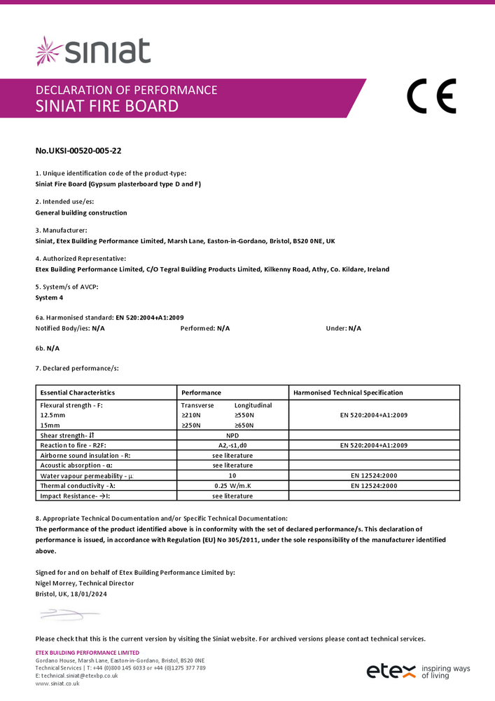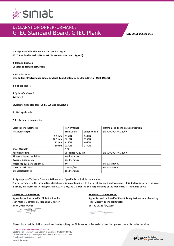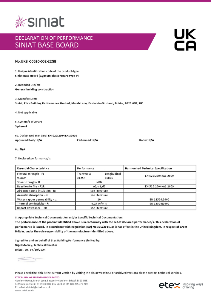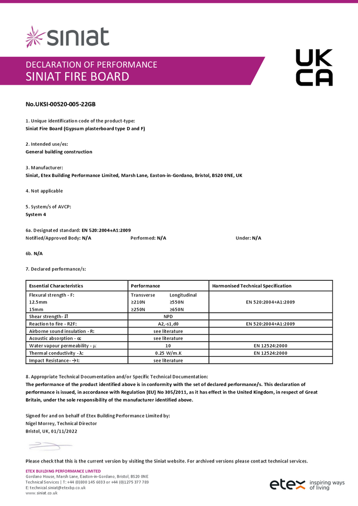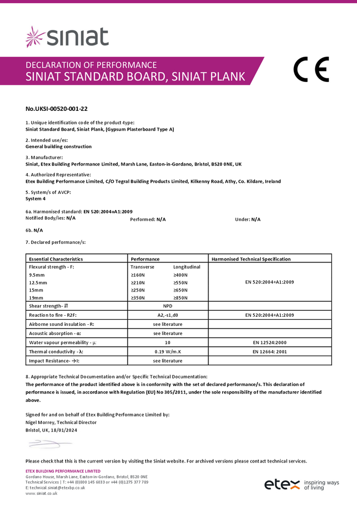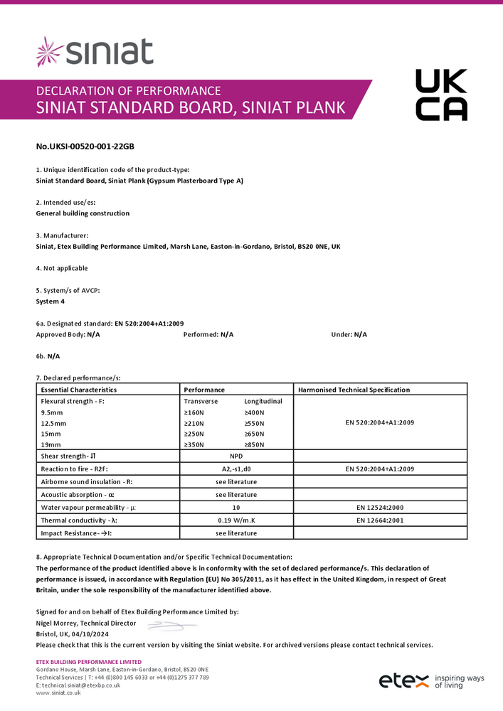 Siniat Standard Board, Siniat Plank DoP (CE) UKSI-00520-001-22