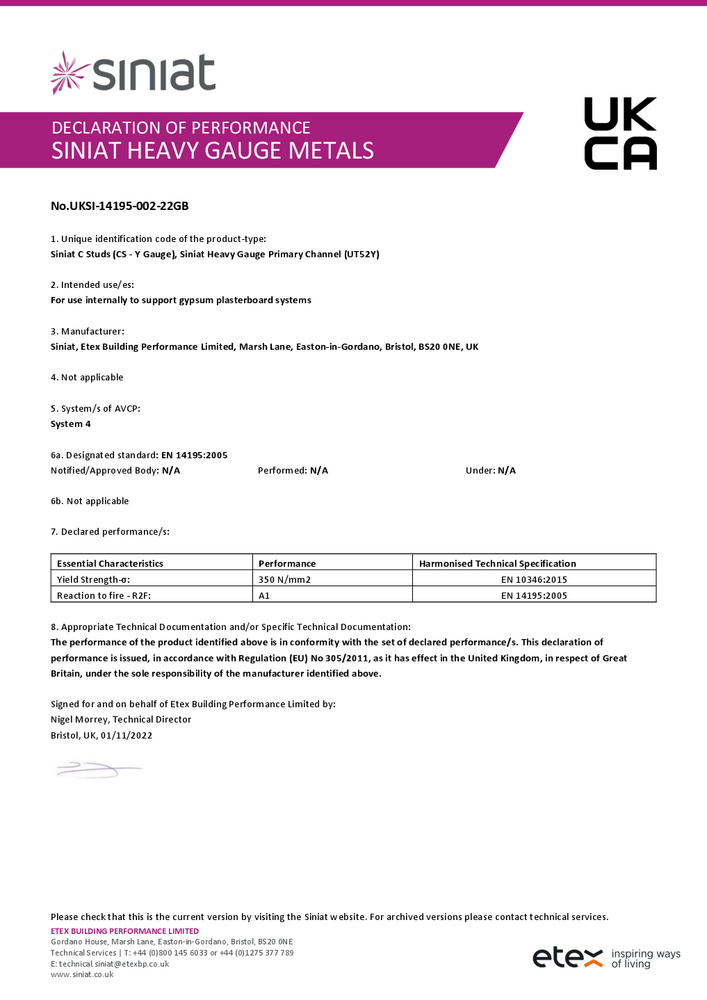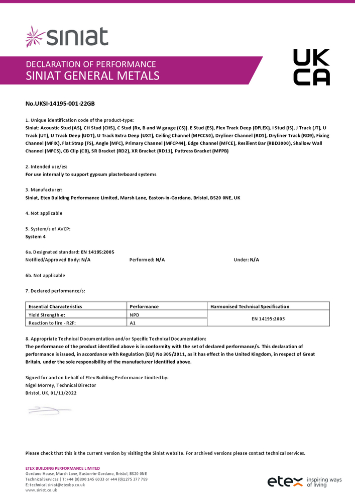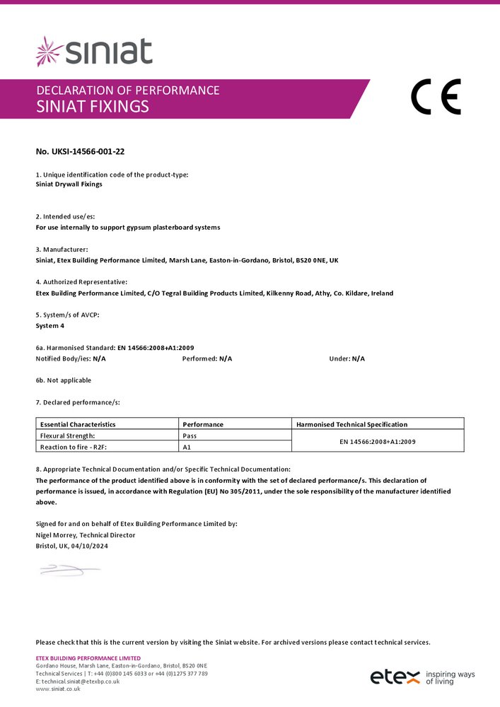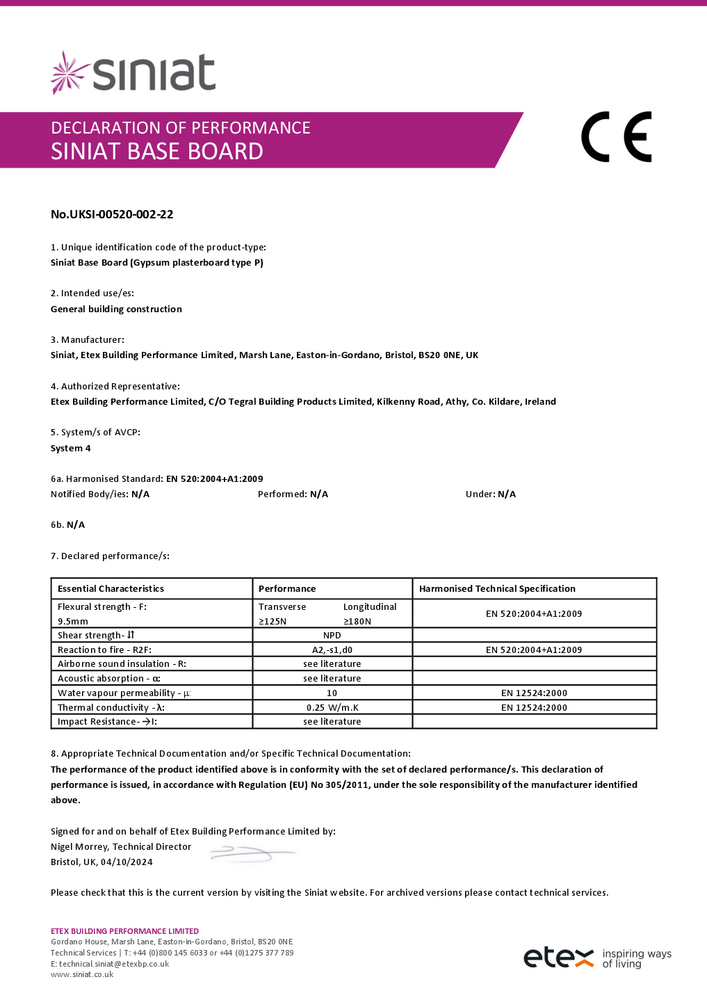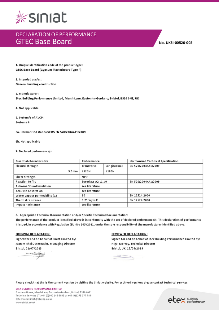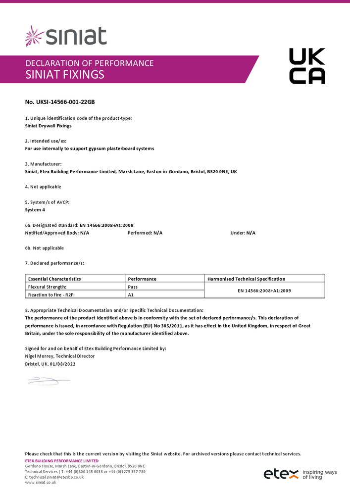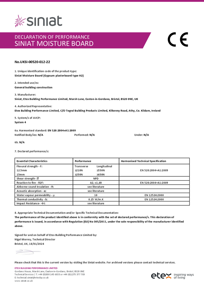 Siniat Standard Board, Siniat Plank DoP (CE) UKSI-00520-001-22