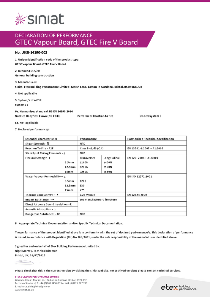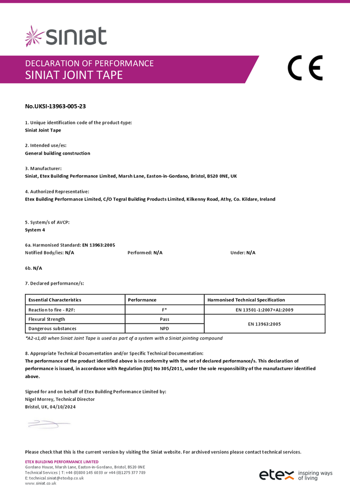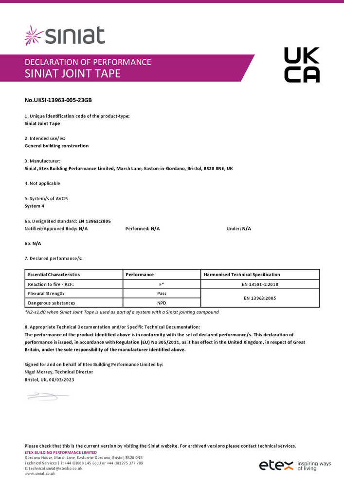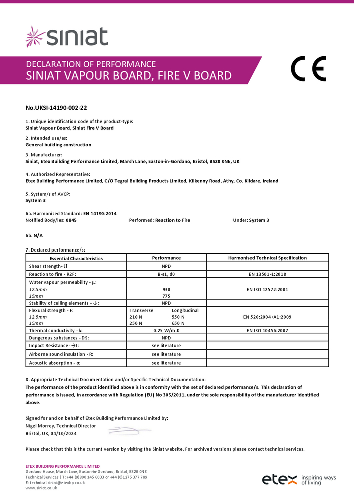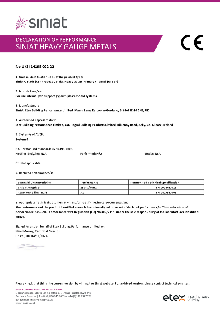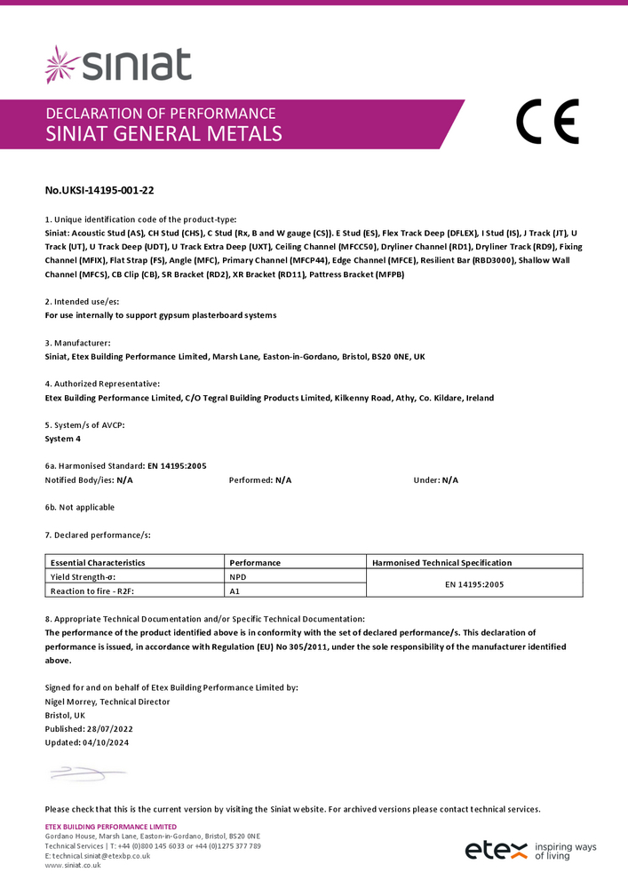 Siniat Standard Board, Siniat Plank DoP (CE) UKSI-00520-001-22