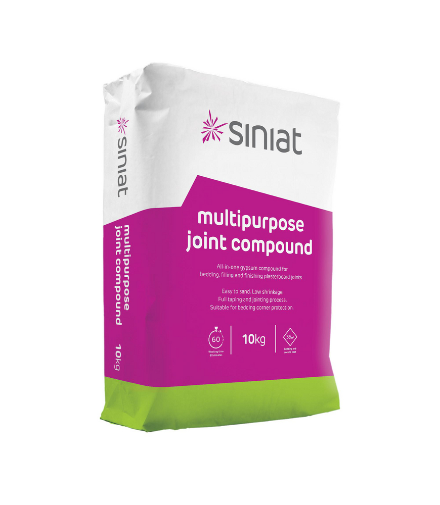 Siniat Multipurpose Joint Compound is a gypsum based compound designed for all 3 stages of the jointing process, including bedding, filling and finishing joints. This can be achieved in one day due to its 90 minutes setting time. It has very low shrinkage and is easy to sand. Hand application only.