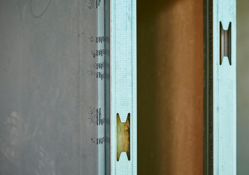 - A 15mm LaDura board was applied to 44mm GTEC Acoustic Homespan Studs with mineral wool cavity insulation to create a narrower partition system which could meet the mullion abutment and maintain a good acoustic performance. At an overall thickness of 75mm, the bespoke partition system also offered an added advantage by maximising the net floor space in the apartments.