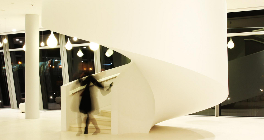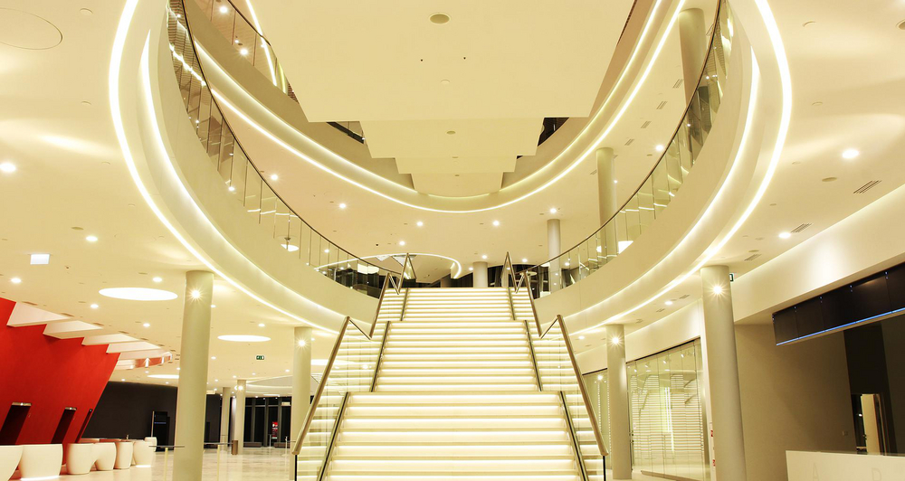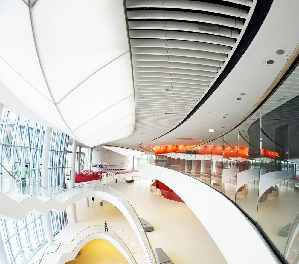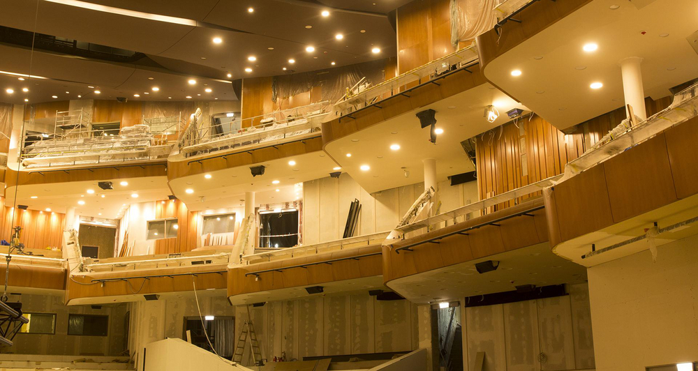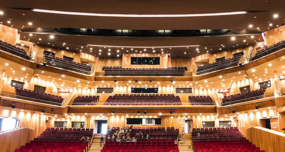 - Although the building is business and cultural centre, without doubt the largest room, is the theatre auditorium which (holds 1915 seats) and deserves special recognition. For the first time the room layout type of a "partial vineyard" (where the stage scene is surrounded by the three sides audience) was utilized. It is due to this, as well as other solutions, that the auditorium is one of the best concert halls in the world. It is about the size of the base of the Great Pyramid in Egypt and 2 football pitches combined.